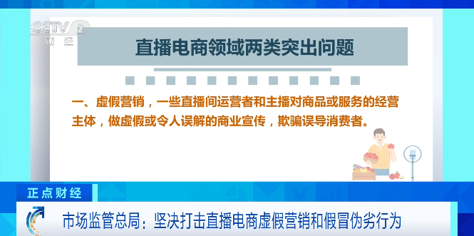 目前,直播电商领域两类问题相对突出,一是虚假营销,一些直播间运营者和主播对商品或服务的经营主体,做虚假或令人误解的商业宣传,欺骗误导消费者。二是假冒伪劣,一些直播间和平台内商家推销和销售掺假、以假充真、以次充好等侵犯注册商标专用权的商品,损害消费者和其他经营者的合法权益。